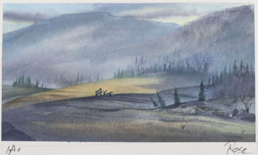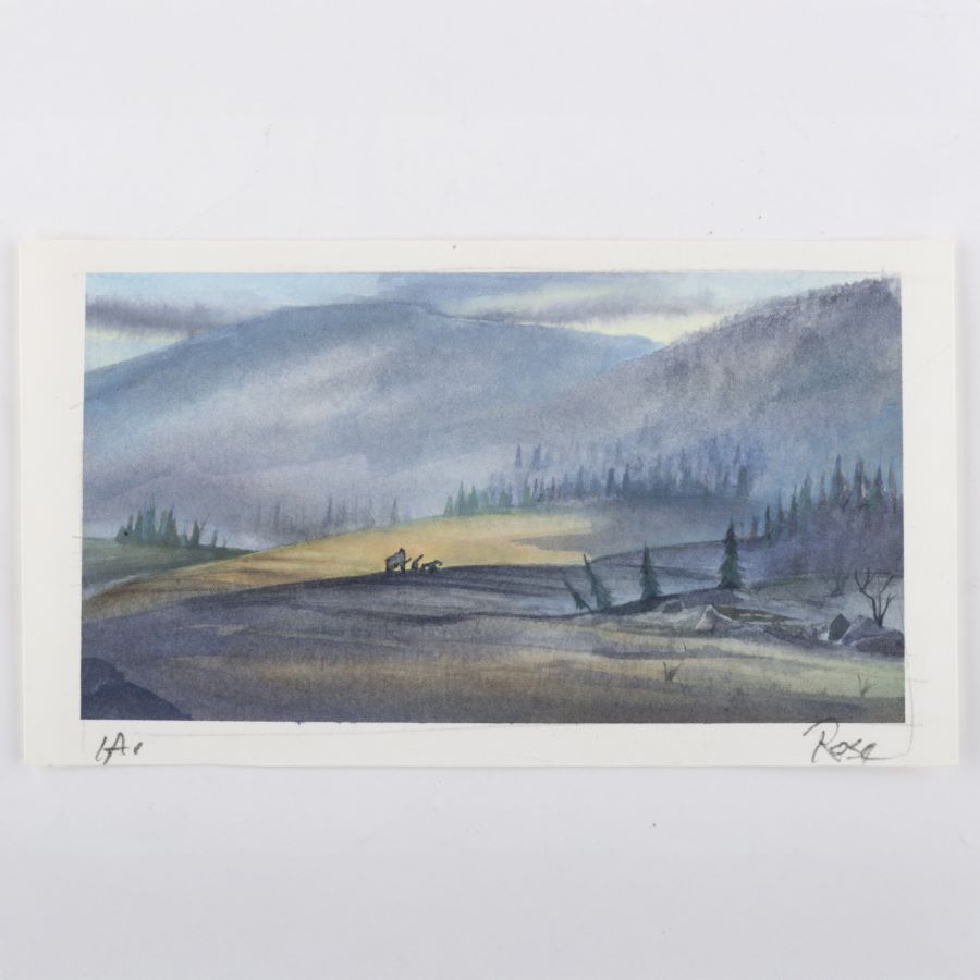 A concept painting from the Fox Studios animated film “Ice Age” (2002). Featuring silhouettes of Manny, Sid, and Diego on their journey, the painting was created at the studio and used during the animation process. This painting was created by studio concept artist Michael Rose, and the painting is hand-signed by the artist below the imagery. Concept imagery is created early in development to suggest and finalize the general layout, color palette, and characters present in a film’s scene. Measuring 4”x7” overall, with the image area measuring 3.5”x6.25”, the concept painting is in very good condition with light edge wear and pin holes in the corners.