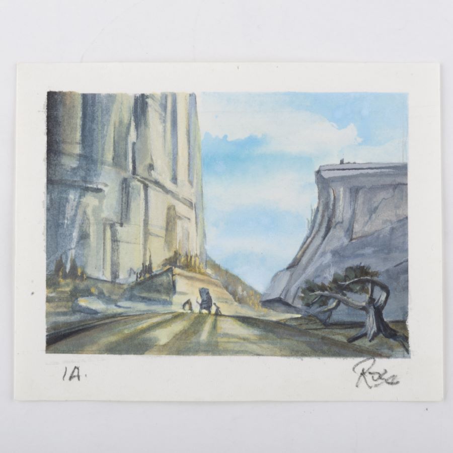 A concept painting from the Fox Studios animated film “Ice Age” (2002). Featuring stunning shot of sunlight penetrating a mountain opening and casting long shadows from the silhouetted main characters, the painting was created at the studio and used during the animation process. This painting was created by studio concept artist Michael Rose, and the painting is hand-signed by the artist below the imagery. Concept imagery is created early in development to suggest and finalize the general layout, color palette, and characters present in a film’s scene. Measuring 4”x5” overall, with the image area measuring 3”x4.25”, the concept painting is in very good condition with light edge wear and pin holes in the corners.