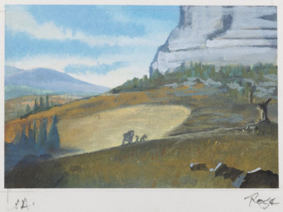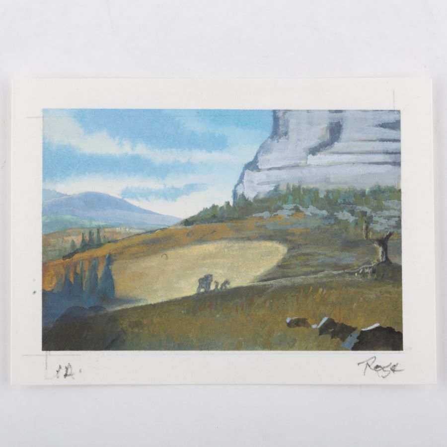 A concept painting from the Fox Studios animated film “Ice Age” (2002). Featuring the silhouettes of Manny, Sid, and Diego walking through a clearing in the wilderness, the painting was created at the studio and used during the animation process. This painting was created by studio concept artist Michael Rose, and the painting is hand-signed by the artist below the imagery. Concept imagery is created early in development to suggest and finalize the general layout, color palette, and characters present in a film’s scene. Measuring 3.5”x4.75” overall, with the image area measuring 2.75”x4”, the concept painting is in very good condition with light edge wear and pin holes in the corners.