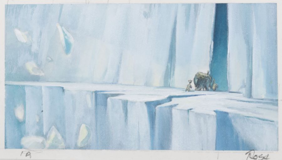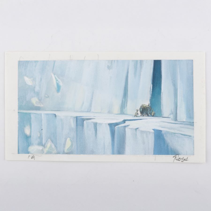 A concept painting from the Fox Studios animated film “Ice Age” (2002). Featuring Manny, Sid, and Diego entering an opening along the glacial shelf, the painting was created at the studio and used during the animation process. This painting was created by studio concept artist Michael Rose, and the painting is hand-signed by the artist below the imagery. Concept imagery is created early in development to suggest and finalize the general layout, color palette, and characters present in a film’s scene. Measuring 4”x7.25” overall, with the image area measuring 3.5”x6.25”, the concept painting is in very good condition with light edge wear.