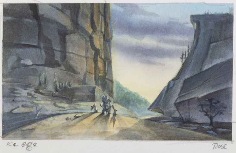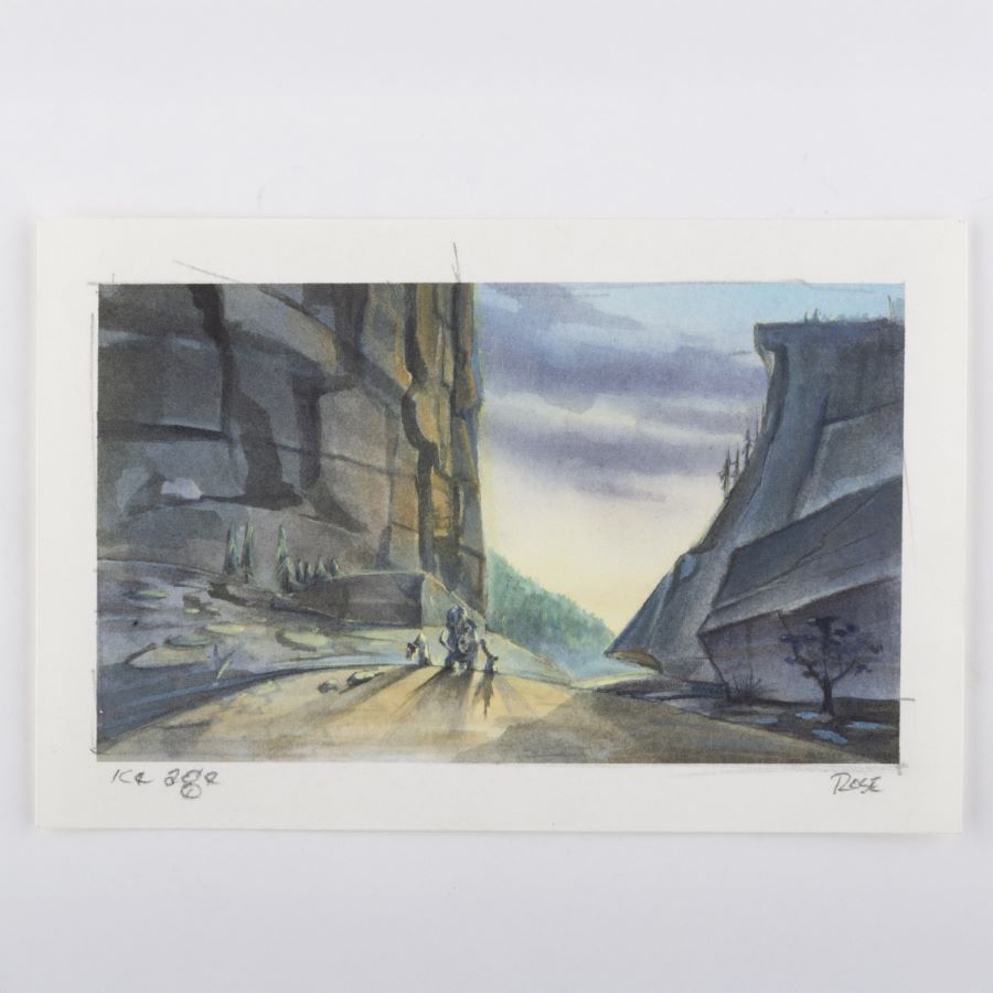 A concept painting from the Fox Studios animated film “Ice Age” (2002). Featuring Manny, Sid, and Diego walking through a valley between jagged mountains, the painting was created at the studio and used during the animation process. This painting was created by studio concept artist Michael Rose, and the painting is hand-signed by the artist below the imagery. Concept imagery is created early in development to suggest and finalize the general layout, color palette, and characters present in a film’s scene. Measuring 4.25”x6.5” overall, with the image area measuring 3..5”x5.75”, the concept painting is in very good condition with light edge wear.